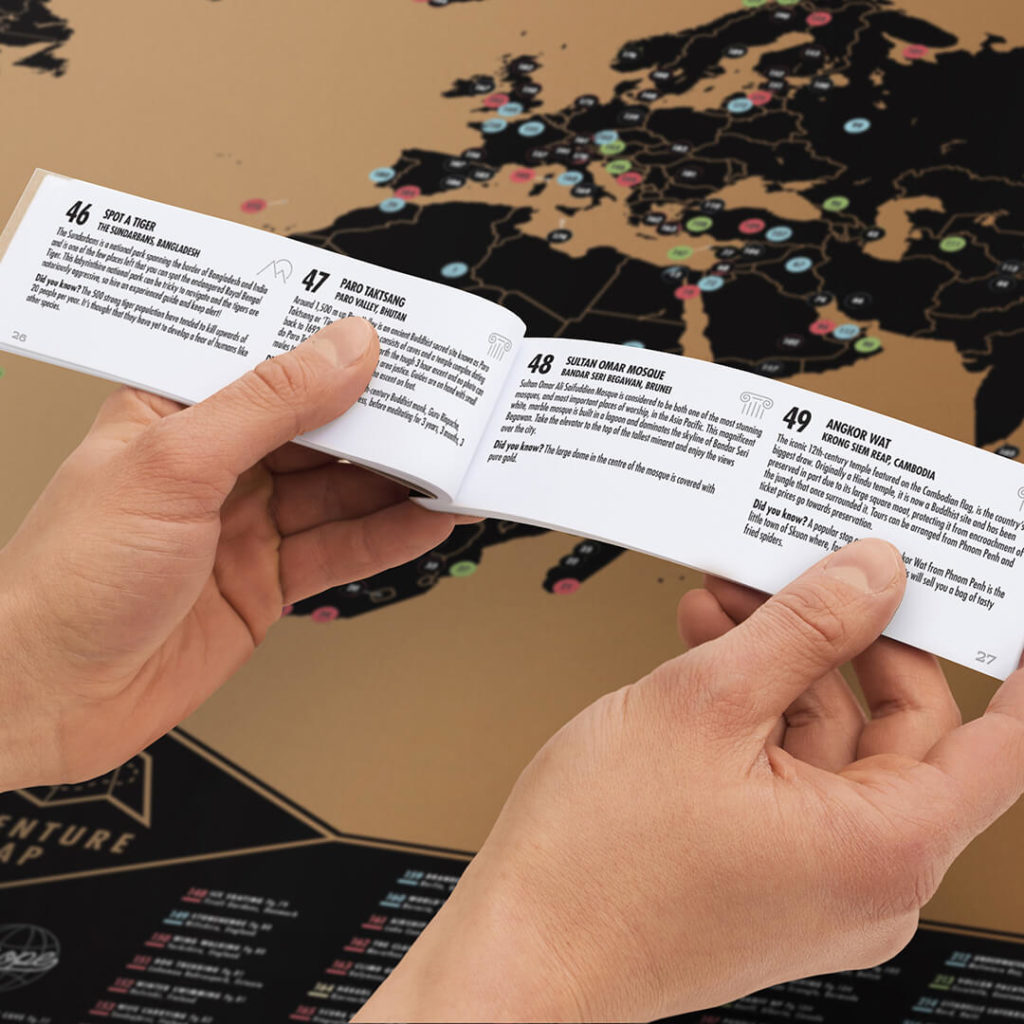 A térképen egy masszív 300 úticélt tartalmazó bakancslista vár meghódításra 4 kategória szerint felosztva: természet, kultúra, aktív programok és konyhaművészet. Ezekről a mellékelt mi füzetből további infókat tudhatsz meg angol nyelven. Látogass el az Angkor Wathoz, ha Kambodzsában jársz, Indiában menj el tigrislesre, Bruneiben nézd meg Omar szultán mecsetét, fuss a bikák elől Spanyolországban (ezt még mi sem ajánljuk), merülj hajóroncshoz Egyiptomban stb. 300 életcél a határokat nem ismerő, bevállalós kalandvágyóknak. Bakancslista világtérkép