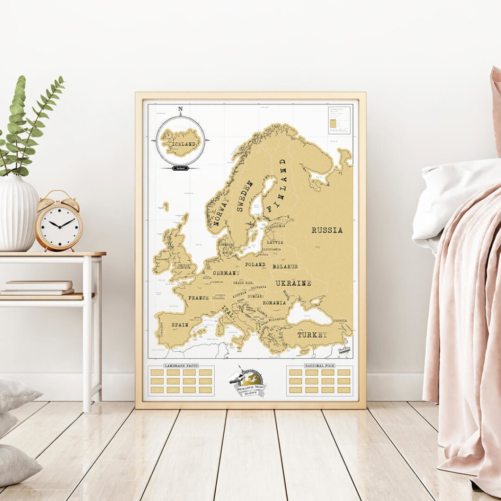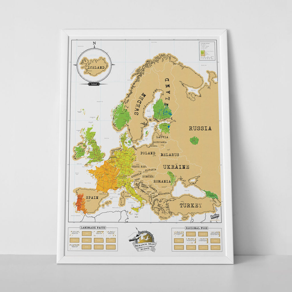 Ha világhódítás még ráér, keressünk közelebbi, könnyebben elérhető célokat, fedezzük fel Európát! A kaparós Európa térkép, nem csak színében (kék alapon ezüst kontinensek), hanem méretében is eltér a többi térképtől, hiszen egyetlen közepes A2-es méretben (54,8 x 43,5 cm) érkezik. Különlegessége még, hogy bal oldalt megtalálhatjuk Európa legfontosabb nevezetességeit az Eiffel toronytól a London Eye-ig és meglátogatásuk után ezeket is lekaparhatjuk, vagy lekaparhatja a szerencsés megajándékozott. Kaparós Európa térkép