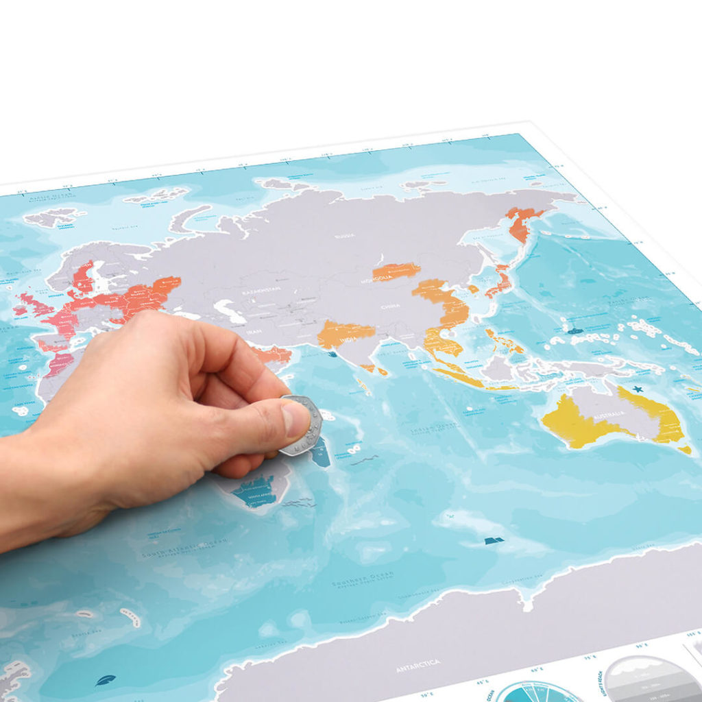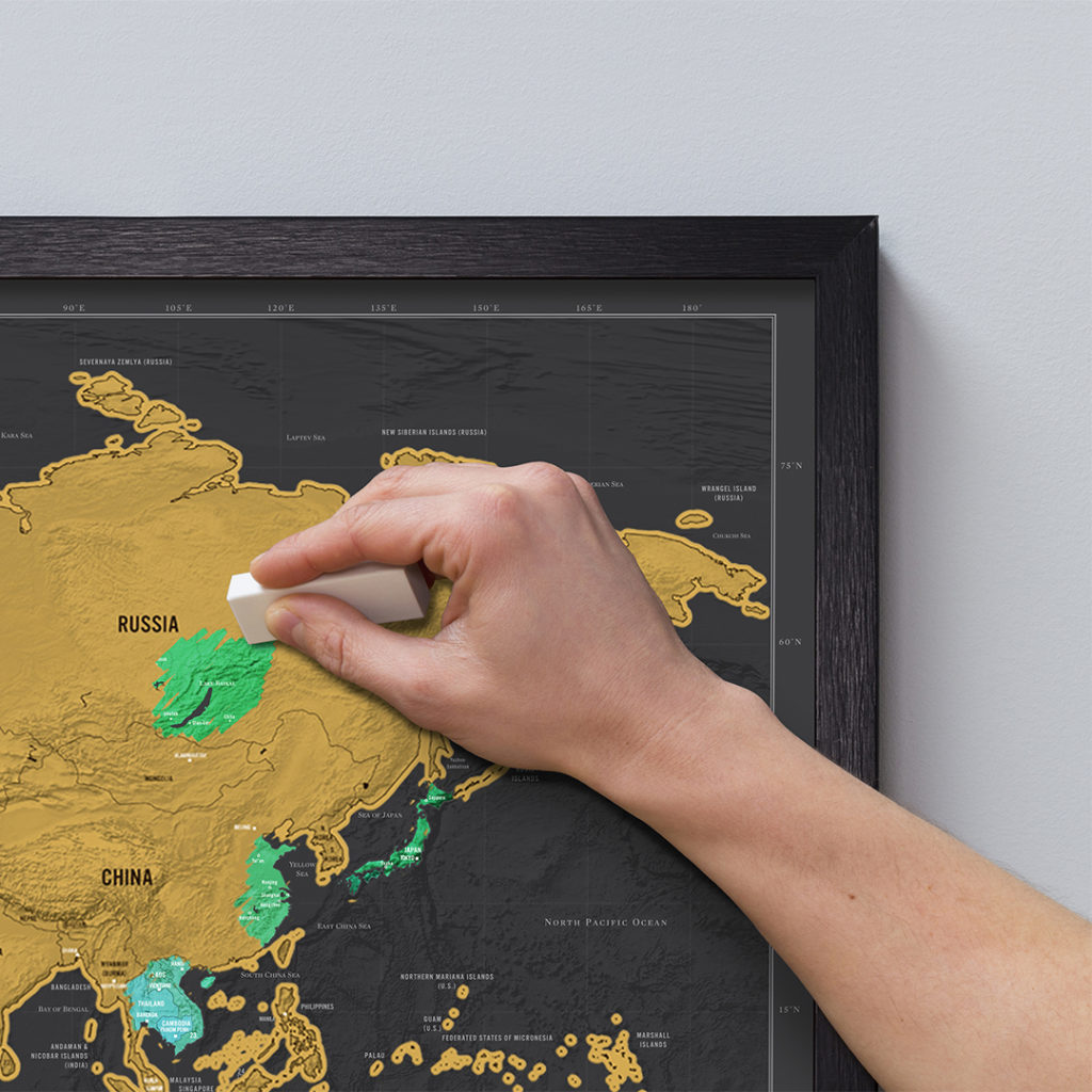 Az iskolai tábla körömmel történő kaparásától nekünk is feláll a szőr a hátunkon, de szerencsére ez nem erről szól. A fekete alapú térképen a „hagyományos” kaparós térképekhez hasonlóan lekaparhatjuk azokat az országokat, ahol már jártunk és azok színesben fognak előbukkanni. Emellett extraként a csomagban lévő fehér szárazfilccel kréta hatású feliratokat, személyes megjegyzéseket írhatunk a térkép fekete részeire, amiket egy ronggyal vagy papírzsebkendővel bármikor könnyen letörölhetünk. Írható és kaparható kréta térkép