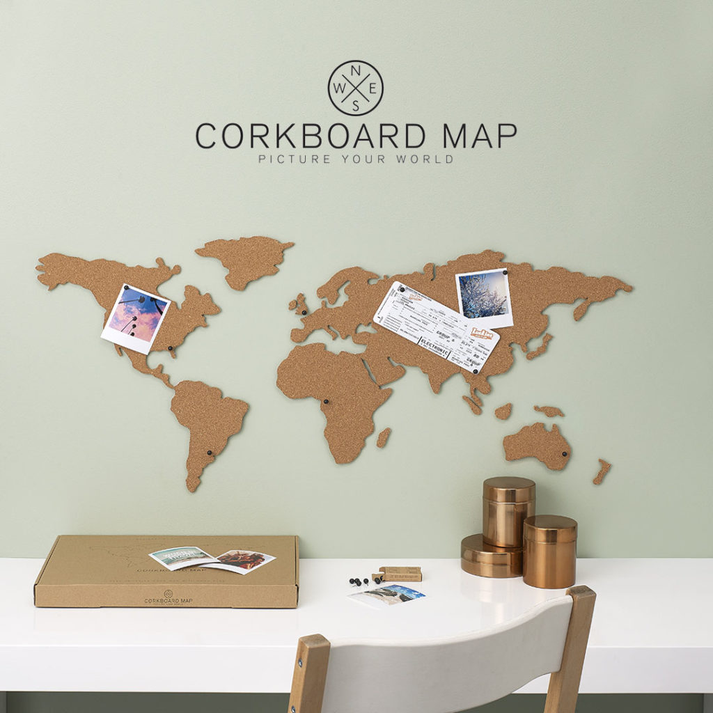 Öntapadós, falra, szekrényre ragasztható 100 x 45 cm-es parafa világtérkép, amire fotókat, képeslapokat lehet rajzszögezni vagy a következő utazást tervezgetni.