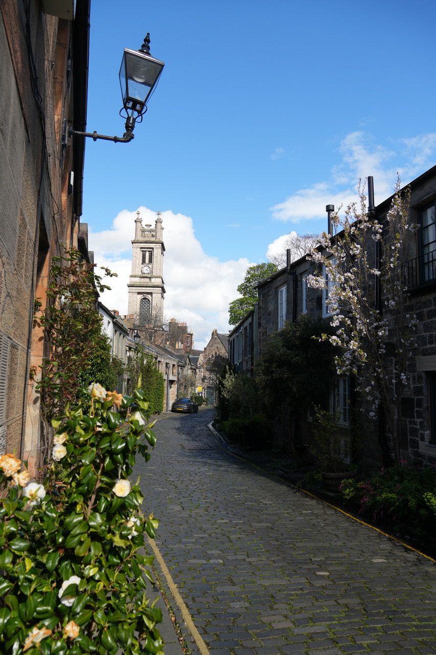 Frissen és koffeinnel feltöltve a Stockbridge Market Arch érintésével a híres Circus Lane felé vettem az irányt. Ez az egykori “mews” (azaz lovarda és istálló negyed) mára Edinburgh legbájosabb és legtöbbet fotózott utcájává vált, és nem véletlenül: a macskaköves, kanyargó sorházak, az ablakokból omló virágok és a háttérben magasodó St. Stephen’s templom toronya olyan látvány, amitől az ember legszívesebben azonnal ideköltözne.
