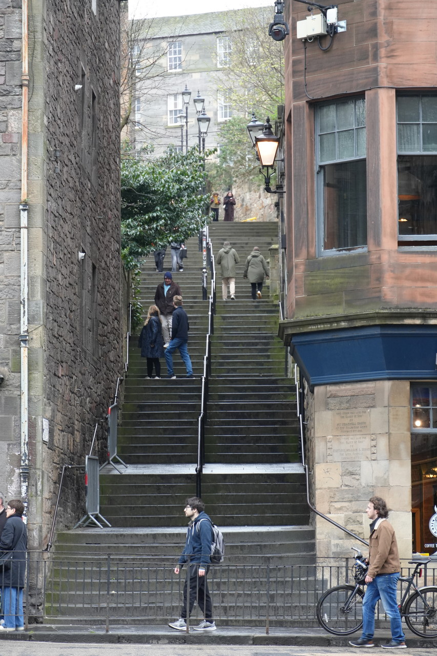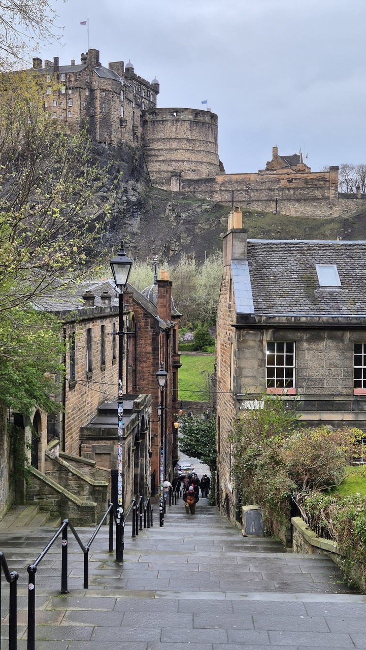 A zápor után a The Vennel lépcsői felé vettem az irányt. Ez az a pont, amit minden Instagram-fotón látsz: a meredek kőlépcsők felett az Edinburgh-i Vár fala olyan dominánsan magasodik, mintha ránk akarna dőlni.