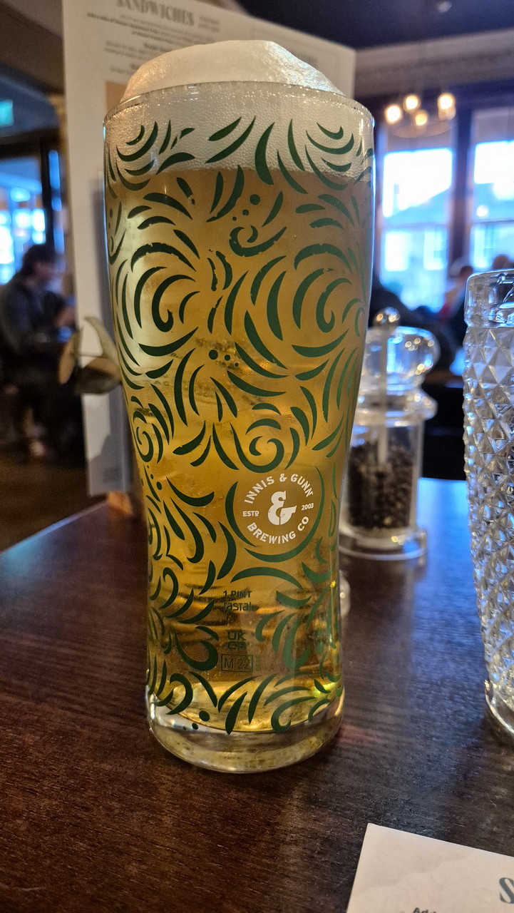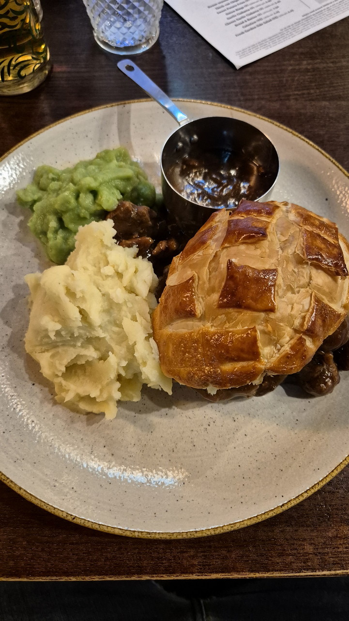 A mai gyaloglás és a hely szelleme miatt saláta szóba sem jöhetett. Valami ízig-vérig skót kalóriabombára vágytam, így rendeltem meg a ház specialitását: a Belhaven Steak & Ale Pie-t, azaz a sörben főzött steak pitét. Amikor kihozták, már a látványtól és az illattól helyreállt a lelki békém.