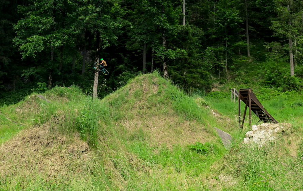 Az út mellett ahogy tekerünk, 3-4 méter magasan bringások repkednek az erdő szélén épített pályán, dombok, ugratók és halfpipe-ok között: