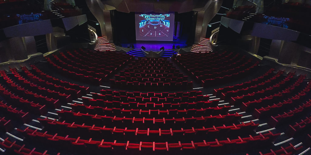 A hajó orrában a színházteremben kezdtünk, megnéztük a studiót, fény- és hantechnikát, majd tettünk egy kört a színpad alatti öltözőkben. Az egész tengeri út során teljesen rendben voltam, de itt reggeli után az ablaktalan helyiségekben bolyongva, kicsit aktívabb hullámzás mellett majdnem visszajött a rántotta.