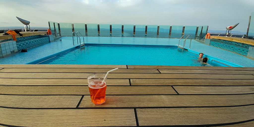 Úgy néz ki a kabinleosztáskor valamit benéztek, vagy mivel ez volt az első hajóútunk így próbáltak kedveskedni (!?), vagy egyszerűen minden olcsó kabin megtelt, de lényeg, hogy a foglalásban megjelölt 5. emeleti belső folyosós, ablaktalan kabin helyett a 12. emeleten kaptunk egy erkélyes szobát! Persze nem hittem el, amíg fel nem szálltunk a hajóra.