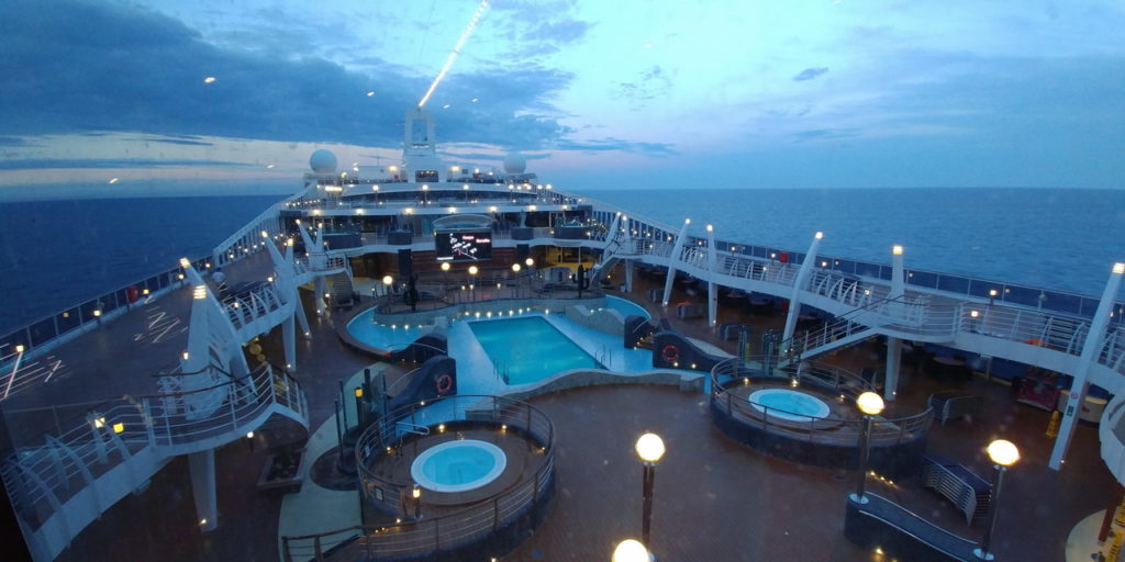 Az ingyenes upgrade okára nem derült fény, de valóban egy a 12. emeleten lévő erkélyes szobát kaptunk. Kb. 12-14 m2, praktikusan berendezve, fürdőszobával, zuhanyzóval, WC. Inkább hasonlított egy 4-5 csillagos szállodai szobára, mintsem egy hajókabinra. Fa bútorok, nagy franciaágy, tükrökkel növelt tér, és a lényeg a padlótól, plafonig üveg ajtó/ablak az erkély, illetve a tenger felé. Foglaláskor felesleges extrának gondoltuk az erkélyt, de tévedés, vagy szándékos csere folytán ölünkbe pottyant ajándék nagyot dobott az amúgy sem gyenge élményen.