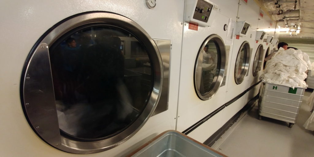 Ezután jön a mosoda. Olyan mosó és szárítógépekkel, amelyek egyszerre 60-120 kg ágyneművel képesek megbirkózni, a hajtogató gépek pedig kb. 3-5 mp alatt vasalnak ki és hajtogatnak élére egy lepedőt.