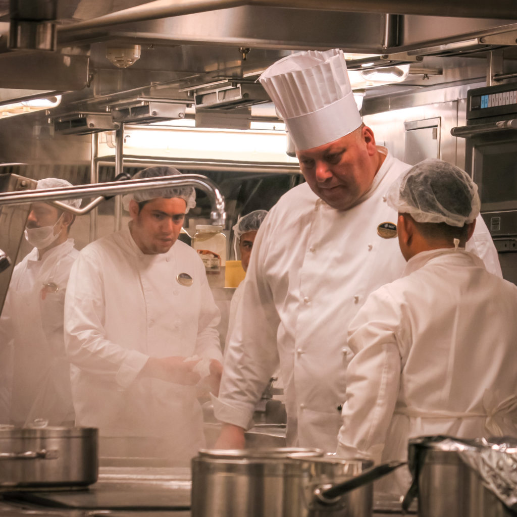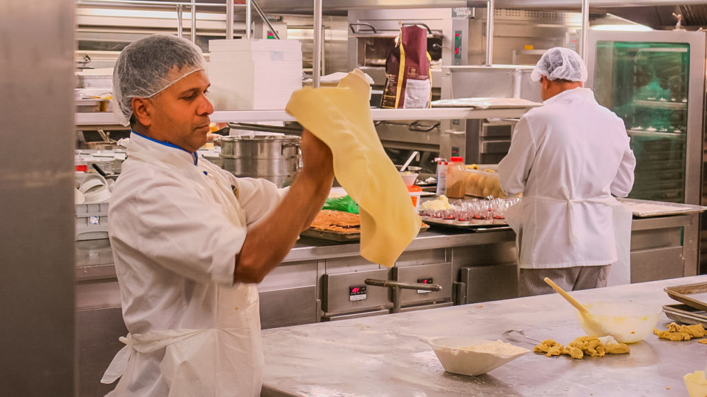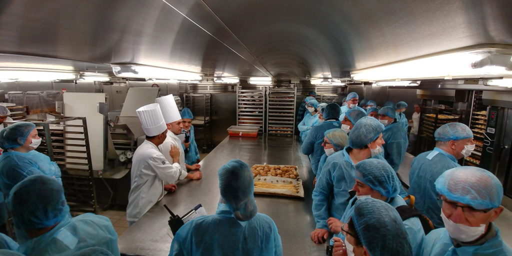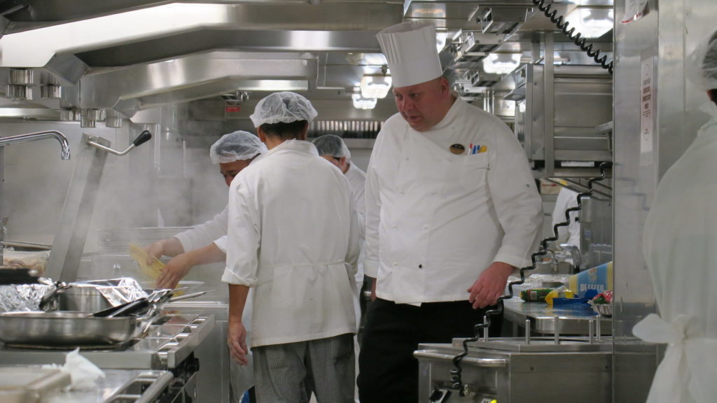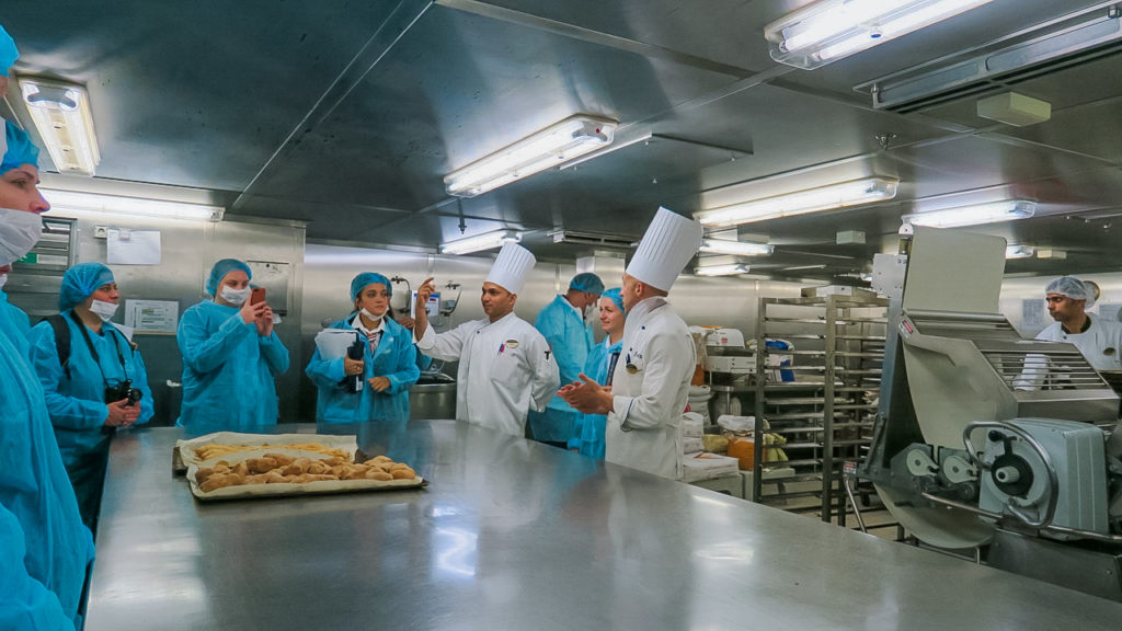 Ezután következett talán a legizgalmasabb rész a “konyha”. De nem egyszerűen konyha, hanem külön, hatalmas pékség, cukrászda, húsfeldogozó, halas, hideg-meleg étel szekció és a raktár. Leírni gyors, de közel egy 1 órát gyalogoltunk ezen a területen. Mindenhol tisztaság és rettenet mennyiségű kaja. 1 héten keresztül, napi 20 órában folyamatos friss kajával ellátni közel 6000 embert elképesztő folyamatszervezést és logisztikát igényel.