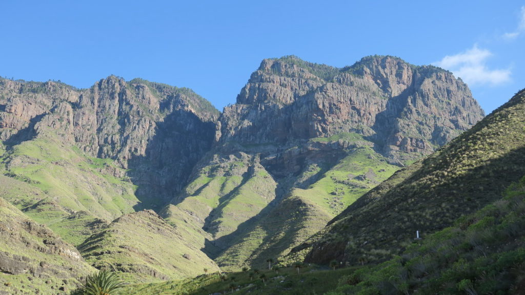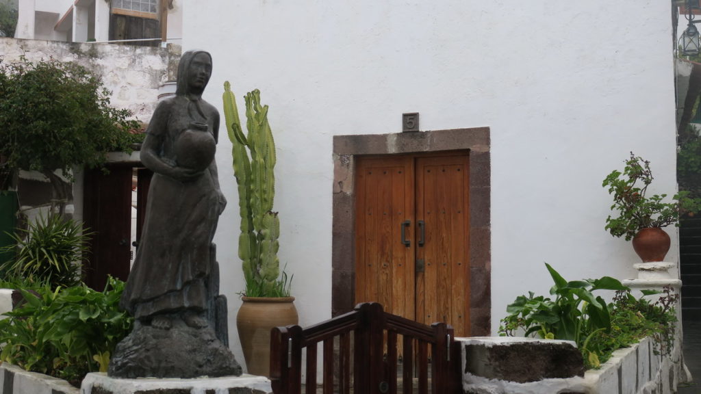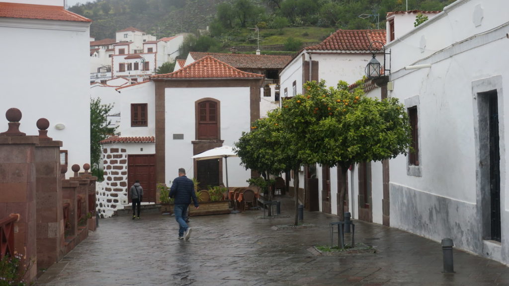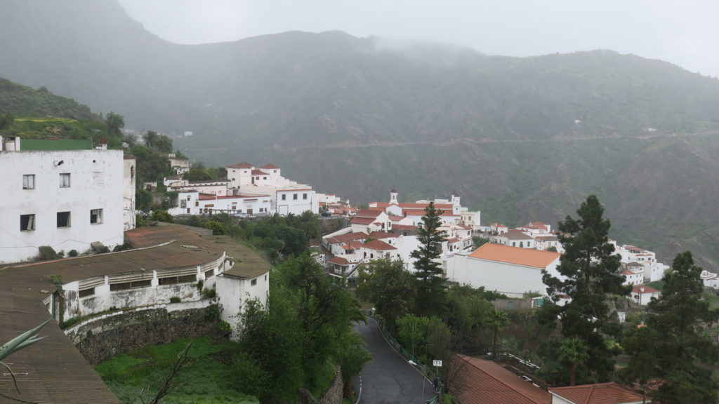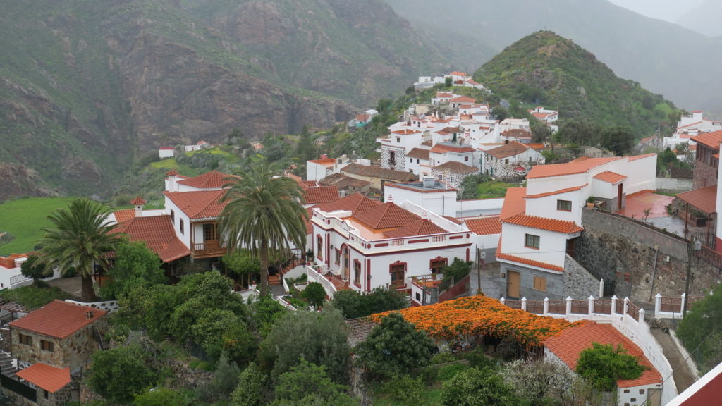 Első megállóm Fataga, Maspalomastól autóval kb. fél órára fekvő kis hegyi falu fehérre meszelt házaival, csendes szűk utcáival. gyümölcsöskertjeivel és az öntözőcsatornák csobogásával egy nyugis pihenő félúton a csúcs felé.