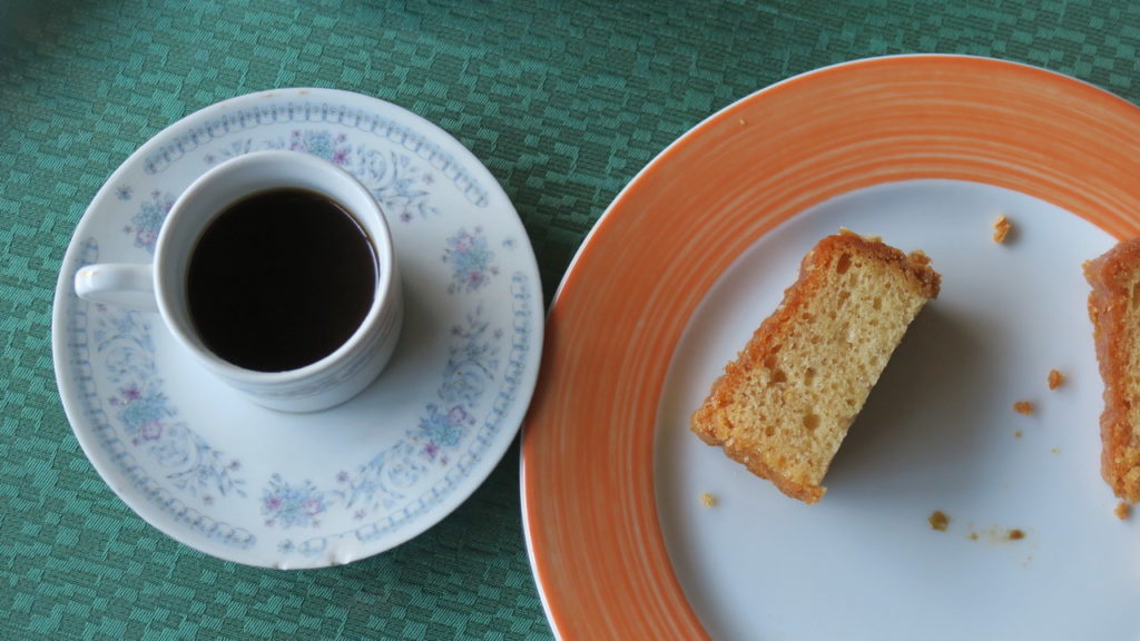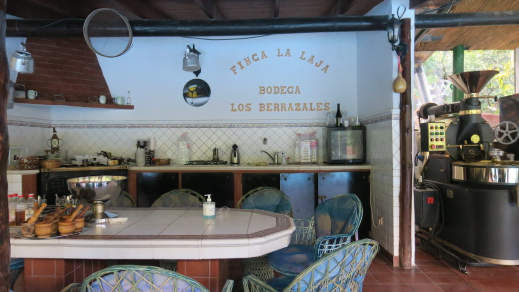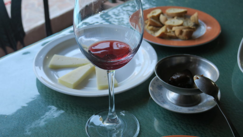 Az egész látogatás végül egy kóstolóban teljesedett ki. Igaz én csak a kávé miatt jöttem, de borászatról lévén szó, nem utasíthattam vissza a borkostolót illetve a csak miattam megterített asztalra kipakolt kísérő falatokat. Autóval érkeztem, de így sem sikerült meggyőznöm a házigazdákat, hogy kihagynám a borkostolót, így kompromisszumos megoldásként kiegyeztünk 1-1 centis kostólókkal. Kísérőként sajtokat, krémes Teror kolbásszal megkent pirítóst, sütit és kávélekvárt szolgáltak fel. És a közel egy órás látogatás legvégén érkezett a kávé. Masszív espresso gép helyett a kotyogósra esküsznek és csak annyi tanácsot adtak, hogy eleve forró víz kerüljön a tartályba és az első kotyogás után azonnal vegyük le a lángot, így a túlzott hőközléssel elkerülve a kávé keserűre égetését.