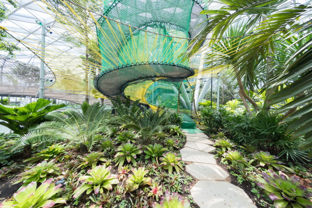 A legfelső emeleten egy 14.000 m2-es kalandpark kapott helyet. Parkokkal, függőhídakkal, különböző nehézségű pályákkal. - Manulife Sky Nets