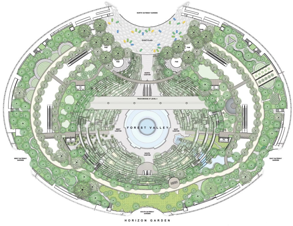 Öt nagy emelet kb. 30-40 méter magas / mély völgy, 3000 fával, esőerdővel. Szingapúr legnagyobb beltéri parkja, erdeje, ami még a legendás Cloud Forestet is veri. - HSBC Rain Vortex: