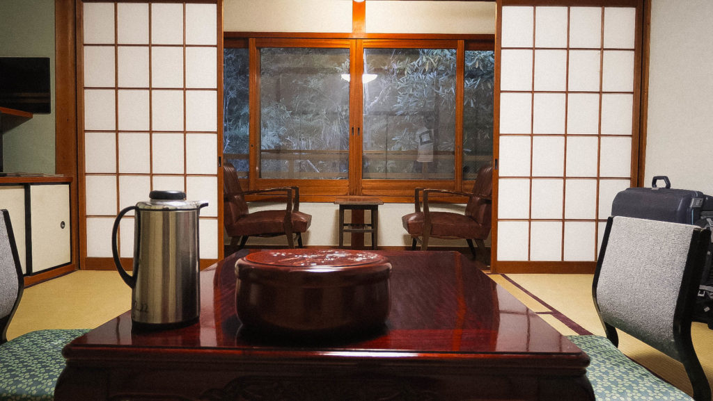 Egyszerű (kb. üres:) berendezésű szobánkat tatami borítja, tolóajtó lehet belépni, kifelé pedig a klasszikus japán négyzetesen osztott ablakok. Odakint körülbelül 5-8 fok lehet a szobában talán ha 12, de kiderül van fűtés, amit ők nem használnak, de ha szeretnénk szívesen bekapcsolják. Szeretnénk.