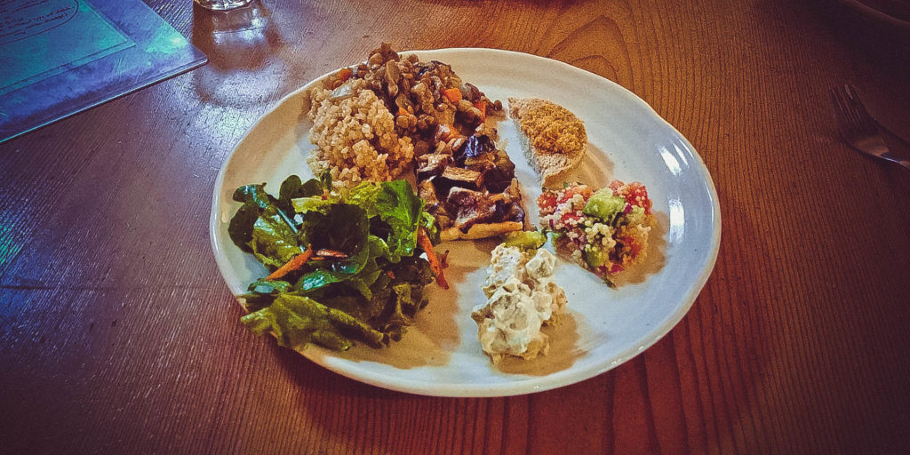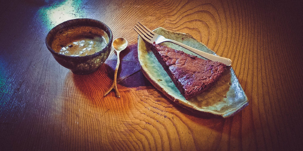 Ebédet a Bon On Shya kávézóban eszünk. Kiderül, hogy a környéken gyakorlatilag csak vegán éttermek léteznek, így nem csak a szerzeteseknél vacsorára, de itt délben is kimarad a hús. A kiszolgálás kedves, az ételek, italok saját készítésű kerámia edényekben érkeznek, mivel az kávézó egy fazekas műhely ajándékboltja is egyben. A főétel + süti + kávé vagy tea ebédmenü kombó ára 1200 yen (kb. 3.000 Ft), ami korrekt ár azért, amit kaptunk, beleértve a kellemes helyet és kiszolgálást.