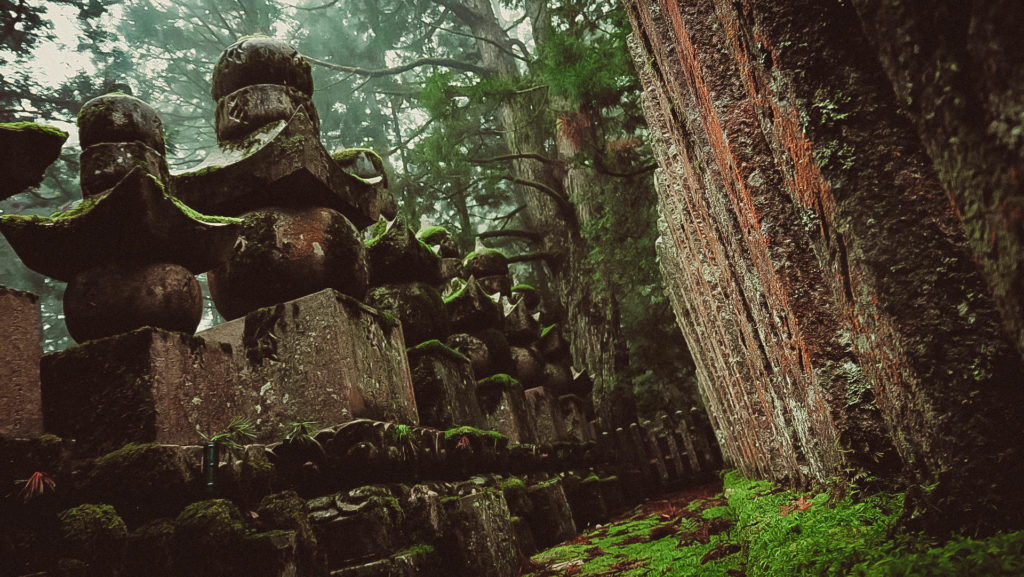 A temető kőhídján átsétálva, mintha egy másik világba lépnénk. A nap már felkelt, de a fő gyalogösvény melletti kőlámpások még pislákolnak, az utat 1200 éves mamutfenyők szegélyezik. A reggeli ködszitálás és szemerkélő eső keveréke különös atmoszférát teremt, az állandó nedvesség pedig remek táptalaj a kőből készült síremlékeket beborító mohának. Mintha a Tomb Raider vagy Indiana Jones legújabb részébe cseppentünk volna.