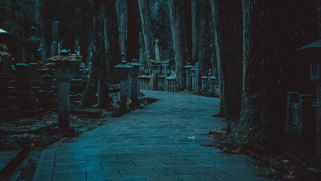Megkérdezik mikor legyen vacsora illetve reggeli. Látszik más napi rutin szerint élünk, vacsora legkésőbb 19 órára kérhető, reggelit pedig reggel 7-ig tudnak hozni, később már nem, így alkudozás helyett kiegyezünk ebben a két, amúgy komfortzónámon kívüli időpontban. Már besötétedett, de a korai vacsoráig még van egy óra, így gyorsan kinézünk Koya-san elsőszámú látnivalójához az Okunoin temetőbe, ahova éjszakai zseblámpás túrákat is szerveznek. A temetőt megtaláljuk és elindulunk, de az első pár száz méter múlva visszafordulunk mert nem sokat látni, elkezd esni az eső és amúgy is ciki lenne lekésni a vacsorát.