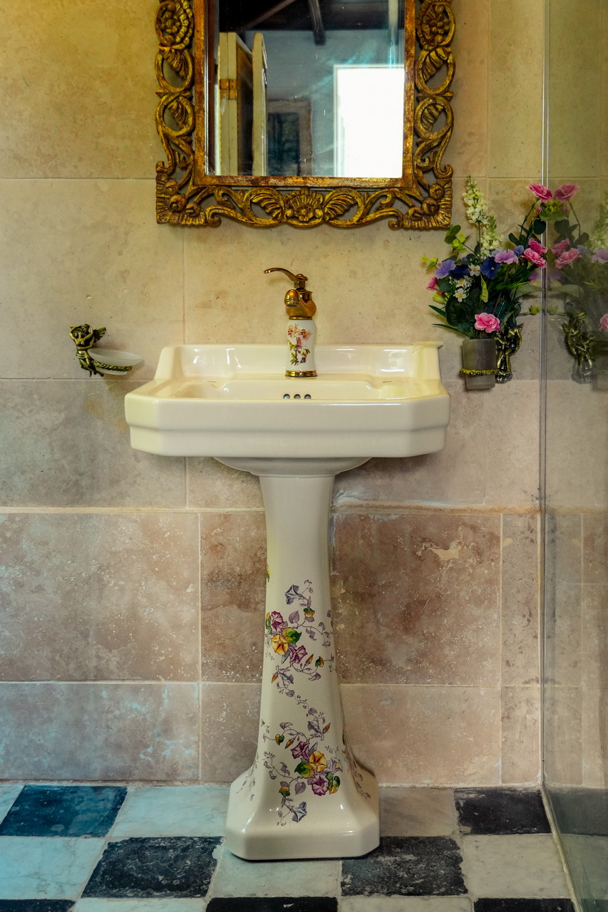 - Porcelaine de Paris: A figyelem a legapróbb részletekre is kiterjed: a fürdőszobákban nem egyszerű szanitereket találunk, hanem a patinás, 1773-as alapítású Porcelaine de Paris manufaktúra kézzel festett remekműveit. Ezek a porcelánok a francia kézműves hagyomány csúcsát képviselik, és harmonikusan illeszkednek a villa 19. századi arisztokratikus légkörébe.