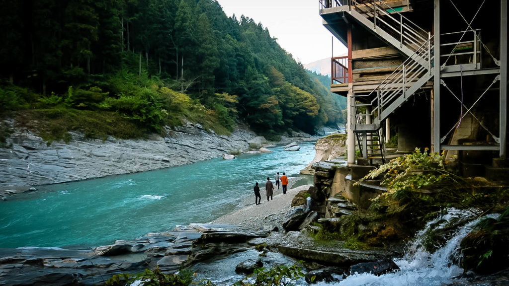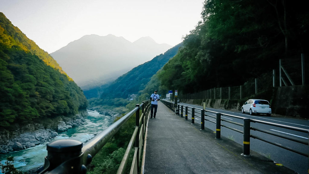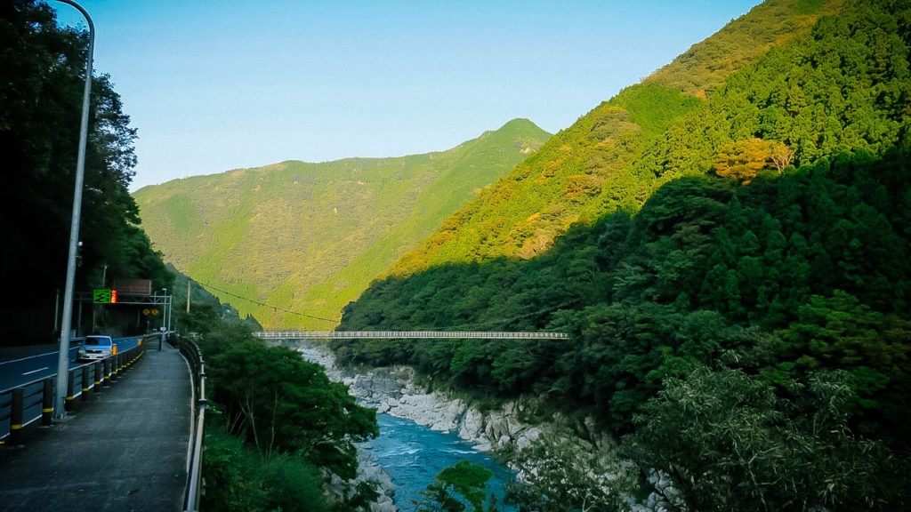 A Tokushima Express autóúton haladunk tempósan nyugatnak (forgalom tekintetében olyan, mintha nem is Japánban lennénk, hanem mintha az M6-oson mennék Pécsre, majdnem üres) majd Miyoshinál lekanyarodunk délre és az utolsó 30-40 km-t a folyó völgyében felfelé kanyarogva tesszük meg, párszor keresztezve is azt.