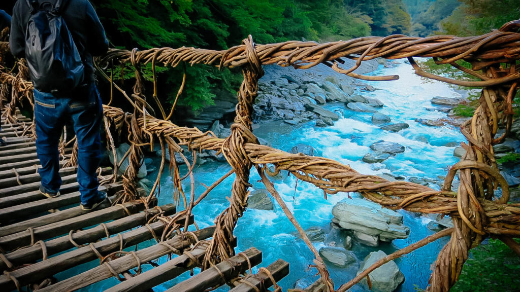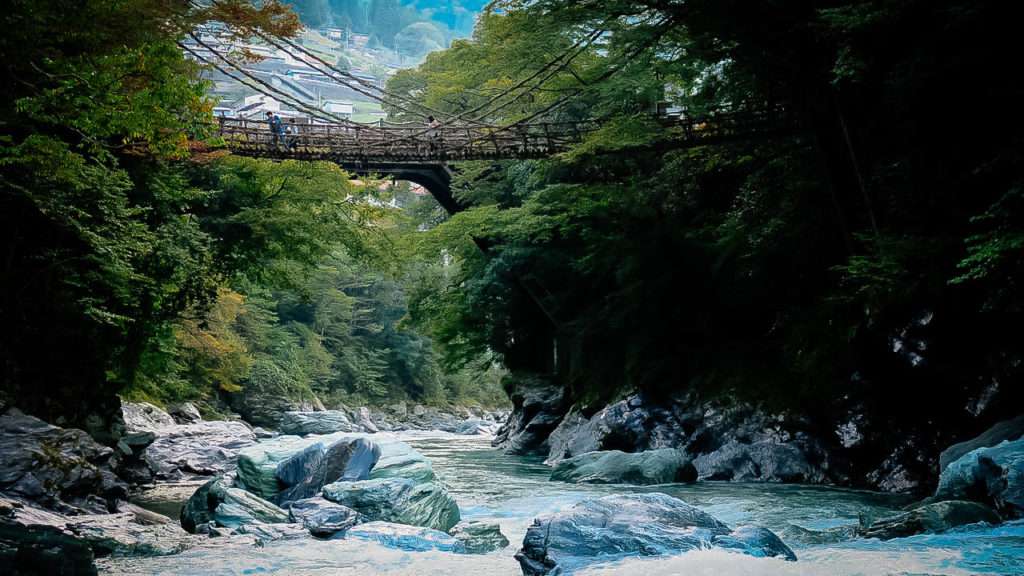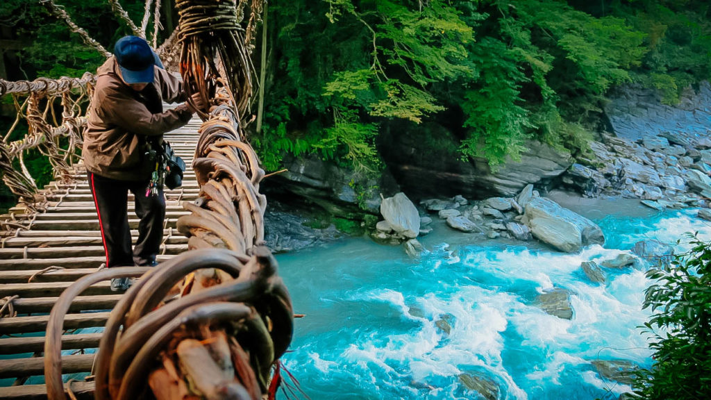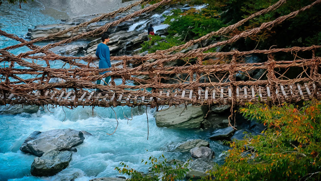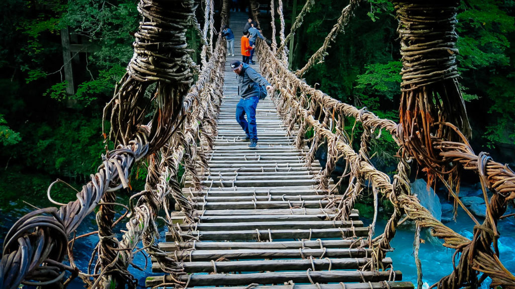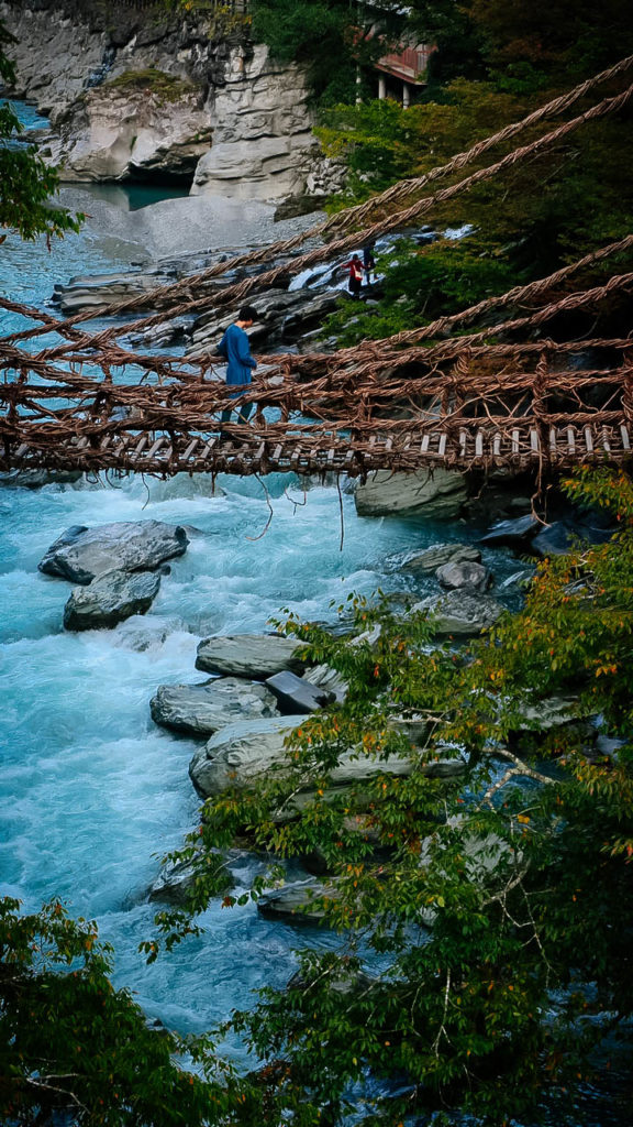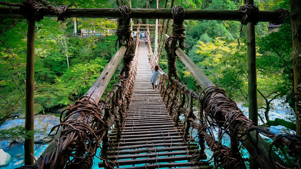 Ahova éppen megérkeztünk az a legnagyobb és legnépszerűbb ilyen függőhíd az Iya Kazurabashi. 45 méteres fesztávval ível át át 15 méter magasan az Iya folyó hömpölygő vadvize felett. A vadregényes híd remek díszletként szolgálna bármilyen dzsungelharcos filmben. Az egyszeri átkelésre jogosító jegy ára 550 yen (1400 Ft). A 2 méter széles híd egyirányú, mert sokan a “korlátra” gyógyulva próbálnak átsétálni, mert már pár ember alatt is van kilengése, illetve a deszkák között van akkora rés, hogyha valaki mellélép, akkor ha nem is darálja be az alatta 15 méterre kavargó vadvíz, de combtőig beragadhat, ami azért kellemetlen. Egyébként nem para átsétálni.