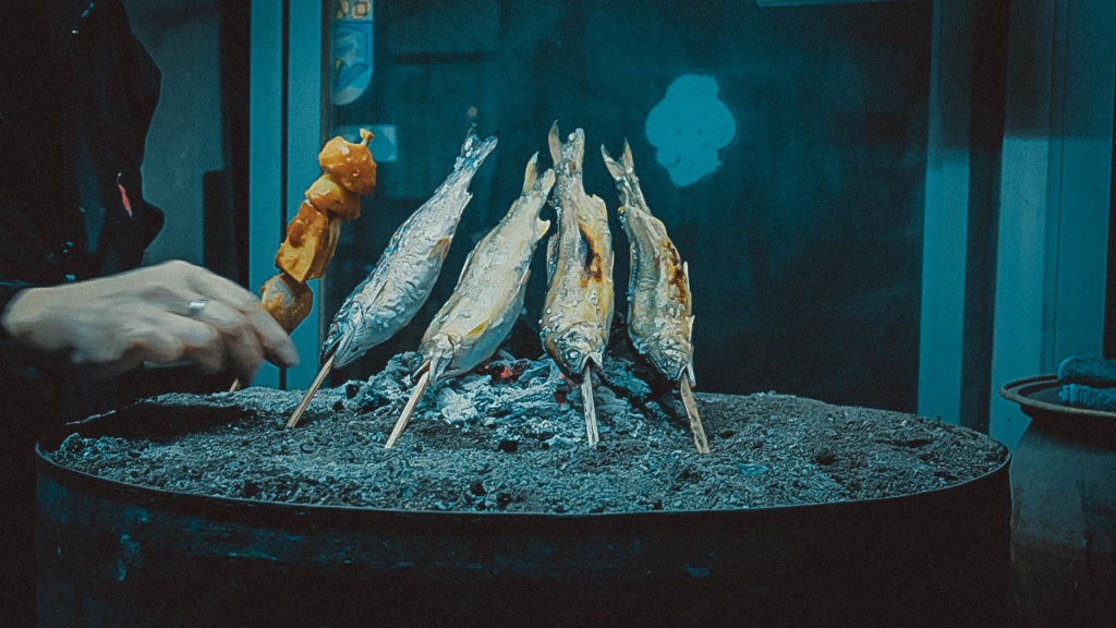 Visszafelé egy kis büfé mellett sétáltunk el, ahol hurkapálcákra húzott halakat (pisztráng?) sütöttek faszénen. Japán Szilvásvárad vagy mi. Hasonló folyómenti halsütögetésbe még többször belefutottunk utunk során.