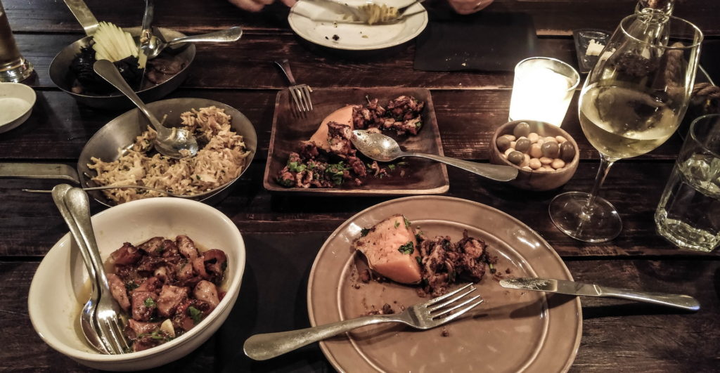 Pár minimál olivás, kenyeres tapas, előétel után berendeltünk egy tintahal “pörköltet” édesburgonyával, a kíváncsiság kedvéért egy véreshurkát (!) zöldalmával, illetve a portugálok egyik nemzeti ételét a bacalhau-t (gyufaszál vékonyra szeletelt tőkehal, hasonlóan julienre vágott krumplival összekeverve, megsütve.)