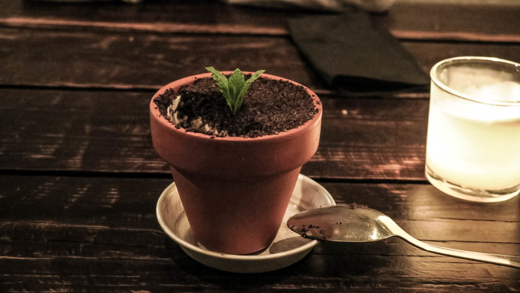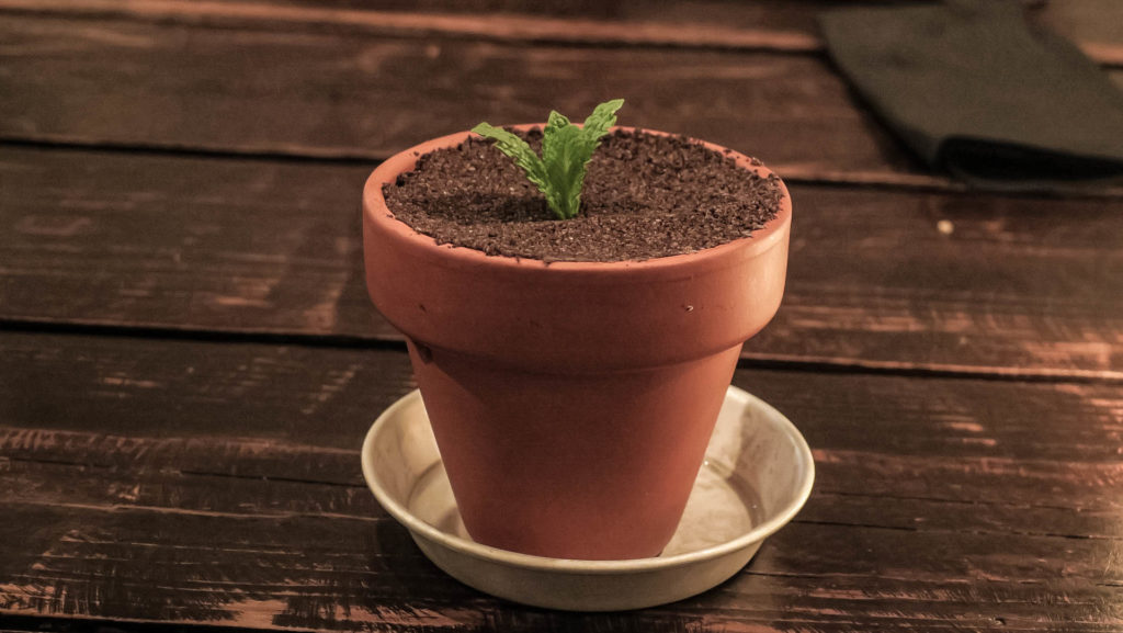 A desszert a végén pedig egy-egy banános sajttorta, amit egy cserép földbe ültetett palántaként szervíroztak. A cserépben a banános mascarpone került alulra, a föld réteget a tetején csoki crumble-lel, a palántát pedig a közepébe tűzött mentalevéllel oldották meg. Frappáns.