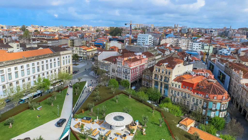 Másnap reggel a R. Das Oliveiras-on keresztül a Carlos Alberto tér érintésével besétálunk a Lisszabon térre (Praca de Lisboa). A tér régen egy piacnak adott helyet, de a 2000-es évek elején teljesen elhagyatottá vált és egy ronda, lepusztult beton-háromszög és pár bódé lecsupaszított rozsdás szerkezete éktelenkedett Porto egyik, amúgy legnépszerűbb szegletében. A Balonas and Menano stúdió építészei remek munkát végeztek, amikor újraálmodták a teret: a föld alatt mélygarázsok, a földszinten üzletek a tér sarkait összekötő passage-okkal és az egész szerkezet – sokkal inkább egy domb, mint épület – kapott egy parkosított zöld tetőt, pázsittal fákkal. A zöld tisztás remekül illeszkedik a környezetéhez.