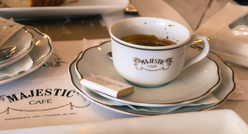 Porto legrégibb, legelegánsabb kávézója, 1921-ben nyílt Elite café néven. A hazai Gerbeaud portugál megfelelője, de sokkal kisebb, így állandóan zsúfolt, nekünk is kb. 10-15 percet kellett sorba állni az utcán, hogy bejussunk. A beltér nyilván szép, de nem szebb, mint a Gerbeaud, viszont hasonlóan túlárazott, 4 euró egy alap presszó kávé, 3 euró 2,5 deci víz, egy komplett reggeliért pedig 30 euró körül kell csengetni. A kávé mellé kért mandulatorta árára nem emlékszem, látványban szép volt, de állagra felejthető, mondhatni száraz. A kávéban is a csésze, tálalás, ami szép, látványos, maga a kávé átlagos. Összességében 10 percnél több sorban állást nem ér, de ha már bejutottunk, akkor egy kávé + süti kombó mellett érdemes kifújni magunkat, lőni pár képet, felkeresni a WC-t, aztán továbbállni.