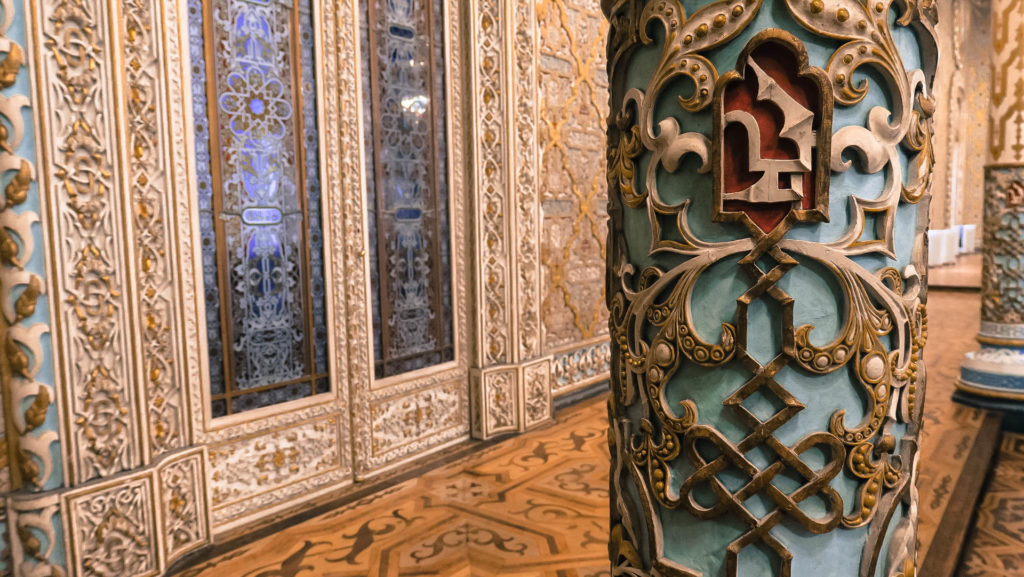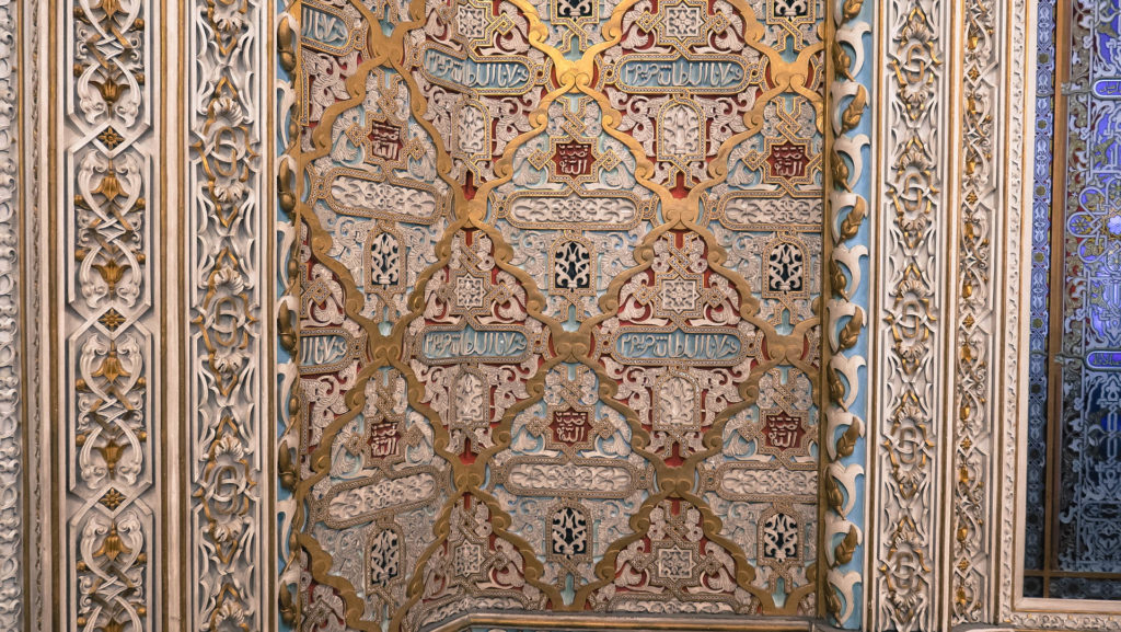 Az üvegkupolás átrium, a tőzsde “parkett”, bírósági tárgyalóterem, kisebb dolgozószobák után a végére marad az épület fő látványossága a granadai Alhambra mintájára készült fényűző Arab terem. Volt vele meló rendesen.