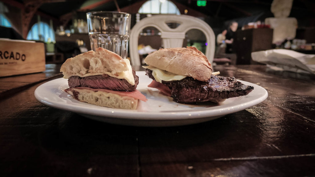 Kiderül, hogy a szakács csak 18:30-kor érkezik, addig ki kell húznunk egy sajt-sonka hidegtállal és némi borral. Fél7 után valóban befut. Komótosan beöltözik, a nyitott látványkonyhában szép lassan előpakolgatja az eszközeit, majd végre belobbantja a kemencét és a grillt is. Amíg a hús sül kirendelünk egy-egy adag bacalhao krokettet is. A szinte portugál nemzeti eledelnek számító, burger helyett, marhahúsos szendvics, sajttal, sonkával is megpakolva ropogós bagettben érkezik. A végén a csatos üvegben tálalt tiramisu semmi extra, de teljesen rendben van. Az italokkal, borokkal együtt összesen 14(!) tételt számláló számla, 2+ órás kajálás, végösszege 2 főre, nagyon baráti 42 euró.