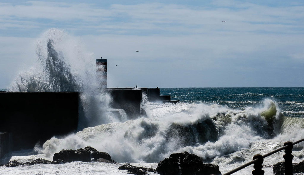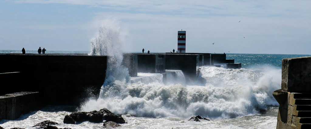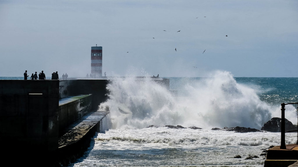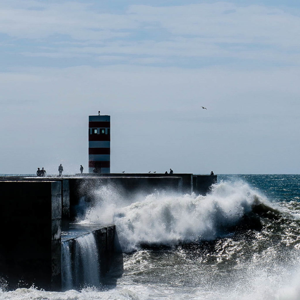 Az enyhe hétvégi forgalomnak köszönhetően kb. 20 perc múlva megérkezünk Foz de Douro-ba és a Passeio Alegre parkon keresztül gyalogolunk a víz felé. A móló elején már figyelmeztető táblák, hogy a 10 méteres hullám nem játék, nagy szélben tilos kisétálni. A szél közepes, illetve páran egészen a világítótoronyig kisétáltak, így nekiindulunk. A ragyogó napfényes időben és közepes időben is brutál 6-8 méteres hullámok ostromolják a beton elemeket, elképzelni is nehéz, hogy milyen lehet igazi viharban, amikor egy nyugis vasárnapon se adna esélyt annak aki ott belepottyan. A fotók közel sem adják vissza a hullámok méretét, erejét, de viszonyításnak annyi, hogy a móló felső “lépcsője” kb. 7 méter, maga a torony pedig 10 méter magas.