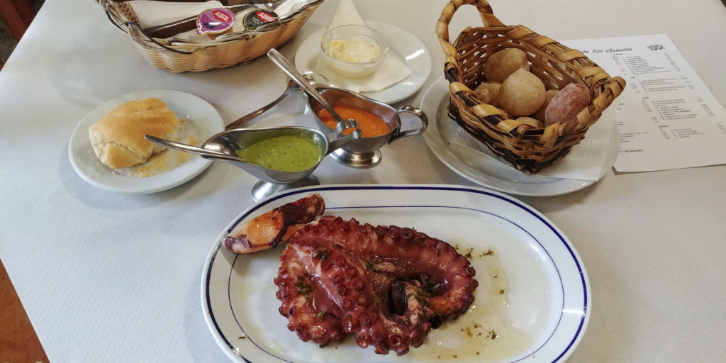 Itt a Meson Los Gemelos-ban a híres grillezett polipot (pulpo a la plancha) választottam, amihez papas arrugadas (ráncos kanári burgonya) és zöld és piros mojo szószok járnak. Brutális adag érkezett, két hatalmas, vastag polipcsáp, volt vagy fél kg szín hús, tökéletesen elkészítve és a kosár köret mennyiségére sem lehetett panasz. Hiába néztem ki előre desszertnek a hűtőpultban figyelő csodás Polvitos Uruguayos-t, ezt a masszív adagot már csak egy barraquito-val tudtam lefolytani.