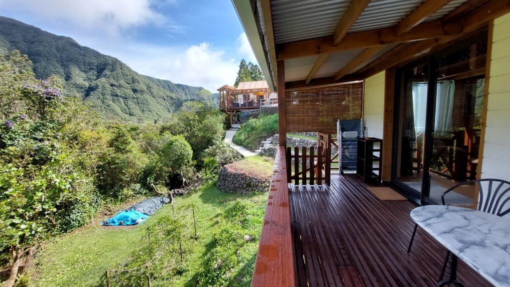 A második szállásom a szigeten, az 1070 méteren fekvő La Plaine-des-Palmistes nevű kisváros egyik szélén, az utca utolsó házának udvarában lévő kis faházban lesz, amelynek a teraszáról pazar kilátás nyílt a környező hegyekre. Étterem sincs sok, illetve holnap reggel korai indulás, így még zárás előtt bevásárolok a helyi szupermarketben a U express-ben és a terasz panorámáját kihasználva a vacsorát és a másnap reggelit is ott ejtem meg.