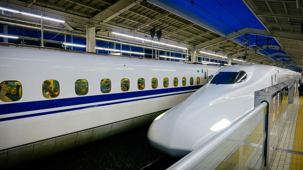 Az útbaigazító táblák, feliratok, egyértelműek, könnyen megtaláljuk hol kell jegyet venni, majd a Shinkansen platformon a vágányunkat is. A kijelzők szerint másodperc pontossággal érkeznek majd suhannak tovább szuper áramvonalas szerelvények (bullet train, ahogy az angol mondaná). A várakozókat 120 cm magas 20-30 cm vastag alufal tartja távol a vágányoktól. A falon zsilipszerűen, automatikusan nyitható ajtók figyelnek, az ajtókhoz pedig a platform padlójára felrajzolt számozott sor vezet. Így nem a vonat beérkezésekor kell rohangálnunk és keresnünk a vagont, hanem már időben, jó előre oda sorakozhatunk fel érkezési sorrendben. 250+ km/h sebességről lassító vonat megfelelő kocsija pedig cm pontossággal ott fog megállni, ahova felsorakoztunk, a védőfal ajtaja pedig szinkronban nyílik a vonat ajtajával.