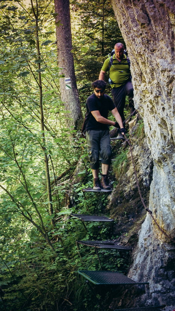 Ezután két szikla közötti járaton kell átpréselnünk magunkat, majd megérkezünk egy katlanba, ahonnan egy újabb fémlétra visz tovább. Ezt követi egy változatos, falépcsős, láncos, létrás szakasz.