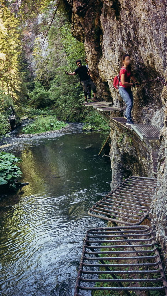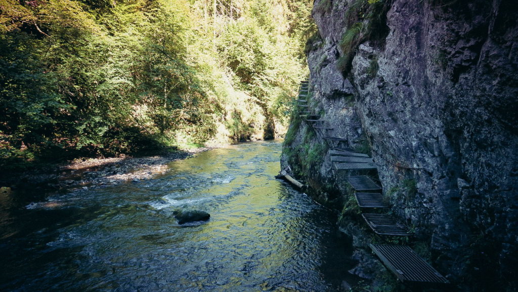 Körülbelül 20 percig folytassuk az utunkat a sárga jelzés mentén, amihez betársul a zöld is. Amikor kettéválnak, mi a térdízület gyilkos, meredek, zöld jelzésű csapáson ereszkedjünk le a Hernád irányába. Körülbelül 15 perc múlva elérünk egy elágazóhoz, itt forduljunk jobbra a kék jelzésre. A kék jelzés a Hernád partján halad végig, egyre jobban megközelítve a vizet, majd egy hídon átkelést követően hamarosan megérkezünk az első izgalmasabb részhez, ahol a sziklafalba rögzített fém tálcákon lépdelhetünk 3-4-5 méterre a Hernád felett. Végig vannak láncos kapaszkodók, de a fogalom itt kétirányú, azaz simán jöhetnek szembe is:)