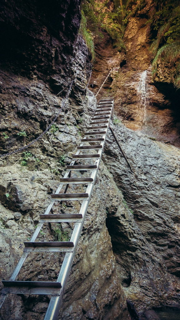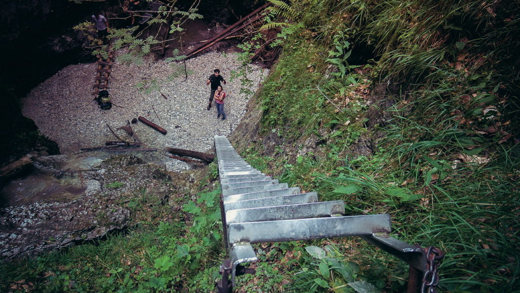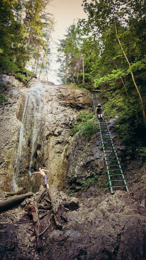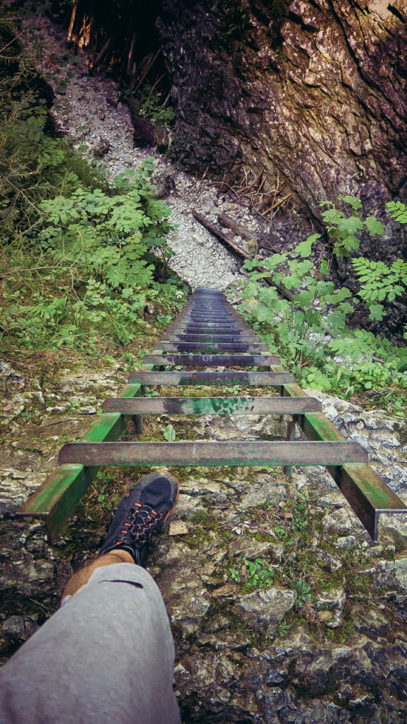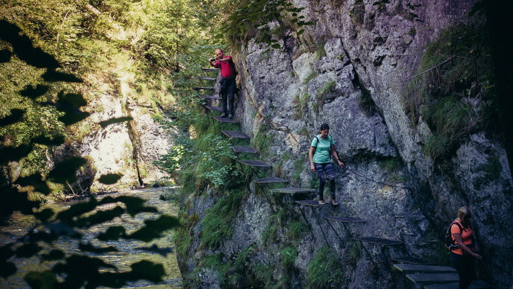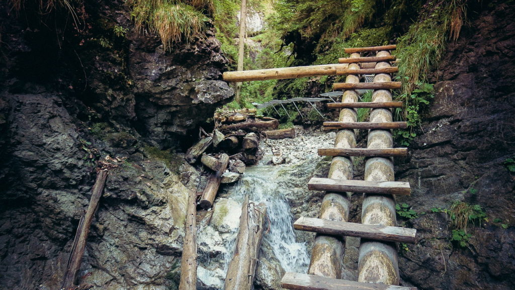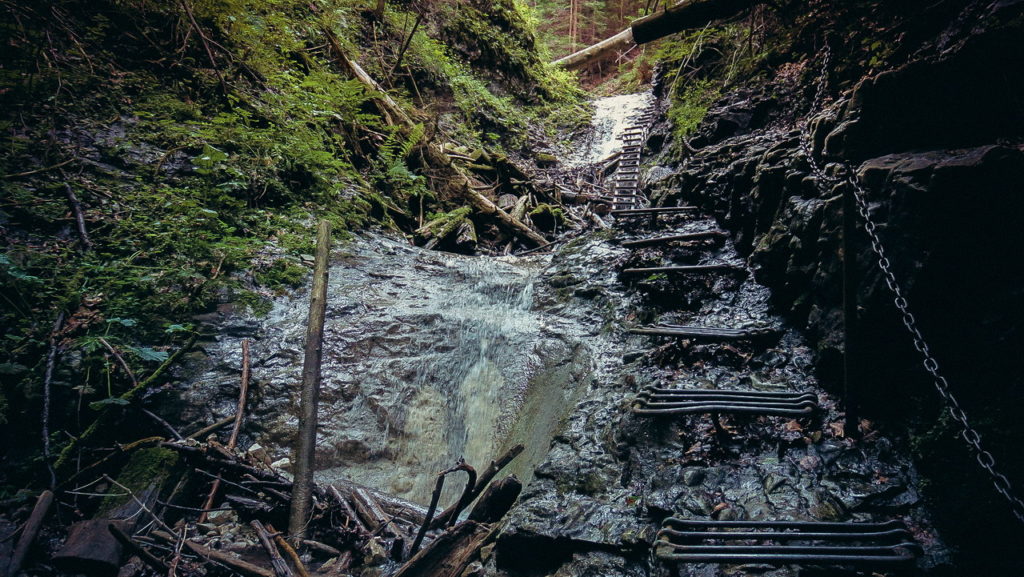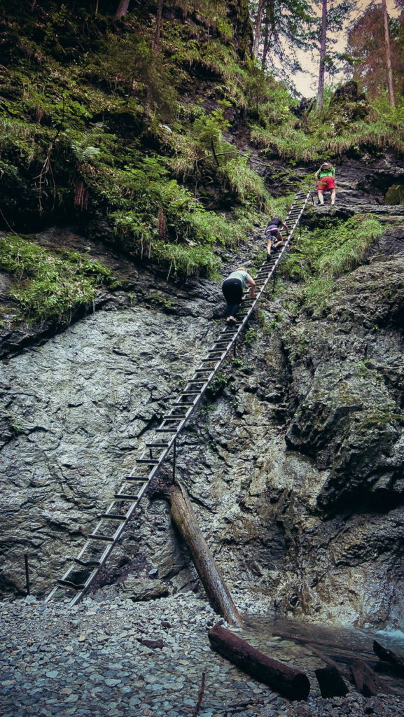 Itt hamarosan kettéágazik az út. A zöld a felfelé egyirányú, lépcsős, létrás szurdoktúra, míg a sárga a mindkét irányban járható, kicsit hosszabb kerülőút (létrák nélkül). Természetesen a zöldet válasszuk. A Sucha Bela-hoz hasonlóan a patak medrében haladunk felfelé, szikláról-farönkre lépkedve. Majd elérkezünk az első nagy vízeséshez, ami mellett két egymásba kapcsolt létra segítségével mászhatunk fel. A teljes akadálypálya körülbelül 1 óra alatt mászható meg.