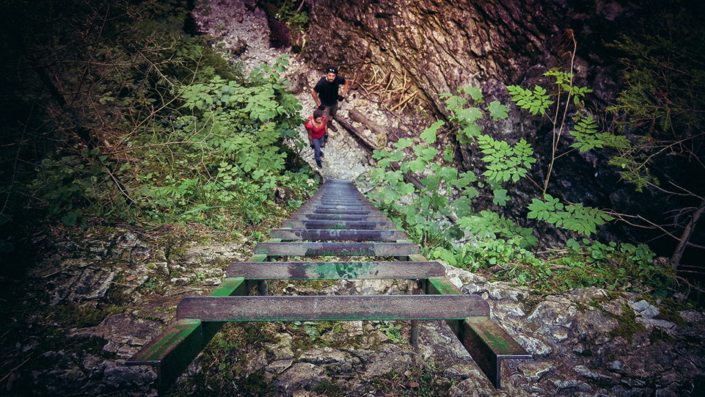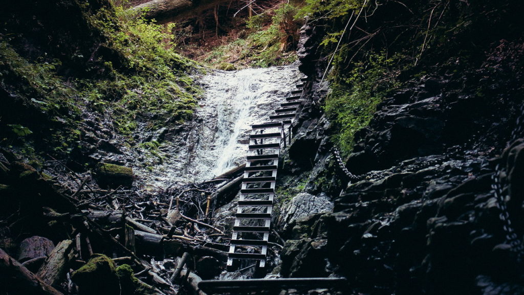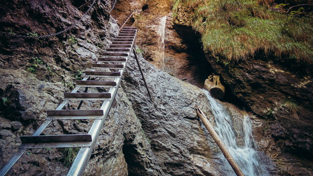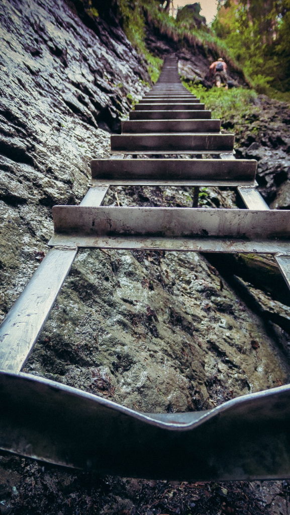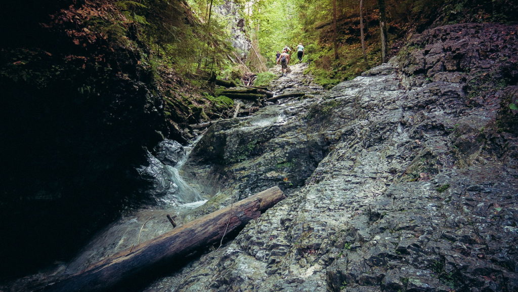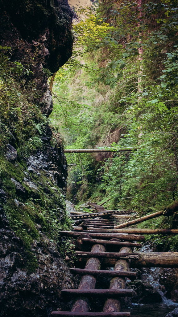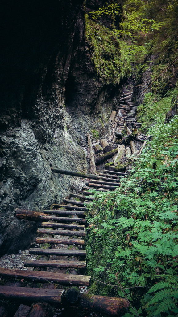 Itt hamarosan kettéágazik az út. A zöld a felfelé egyirányú, lépcsős, létrás szurdoktúra, míg a sárga a mindkét irányban járható, kicsit hosszabb kerülőút (létrák nélkül). Természetesen a zöldet válasszuk. A Sucha Bela-hoz hasonlóan a patak medrében haladunk felfelé, szikláról-farönkre lépkedve. Majd elérkezünk az első nagy vízeséshez, ami mellett két egymásba kapcsolt létra segítségével mászhatunk fel. A teljes akadálypálya körülbelül 1 óra alatt mászható meg.