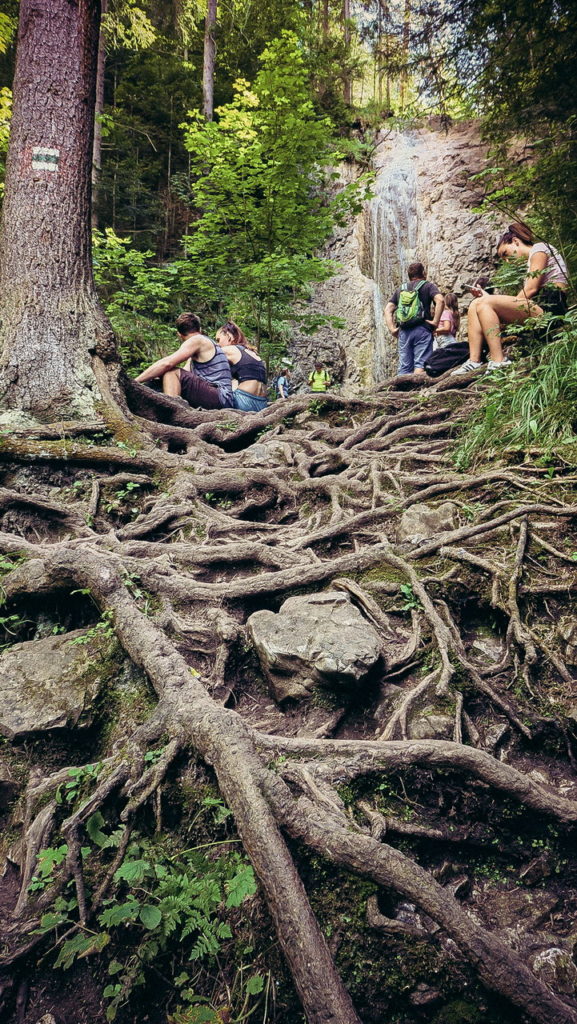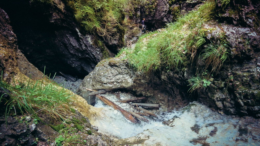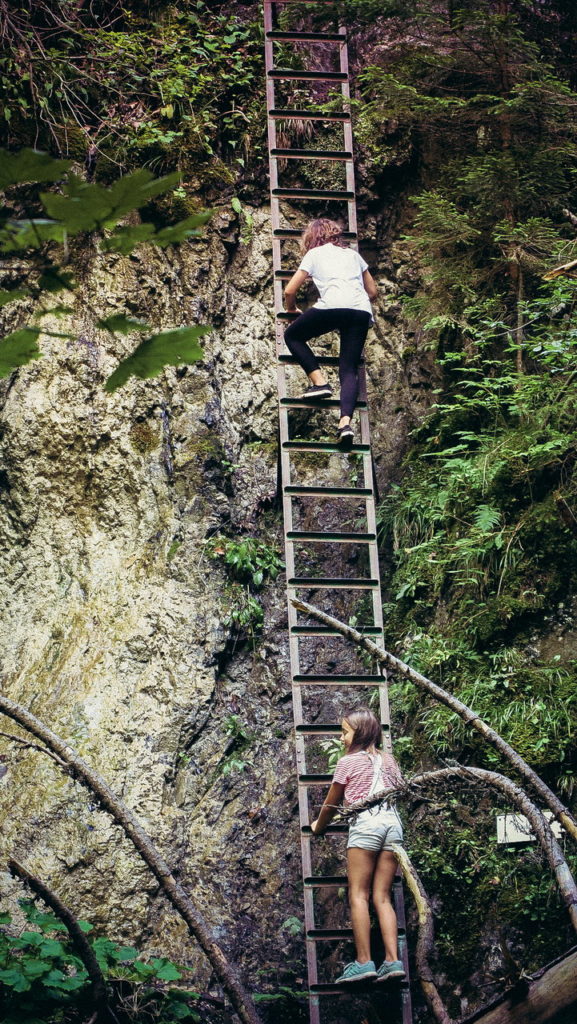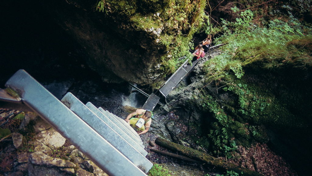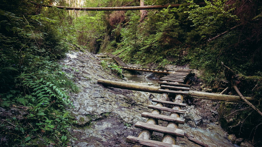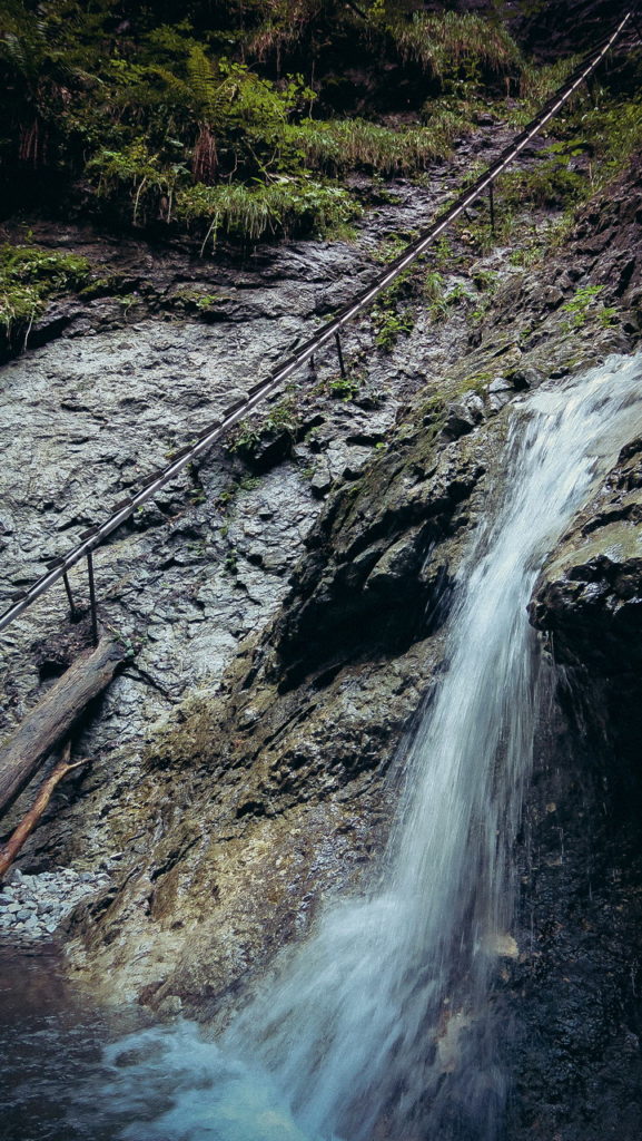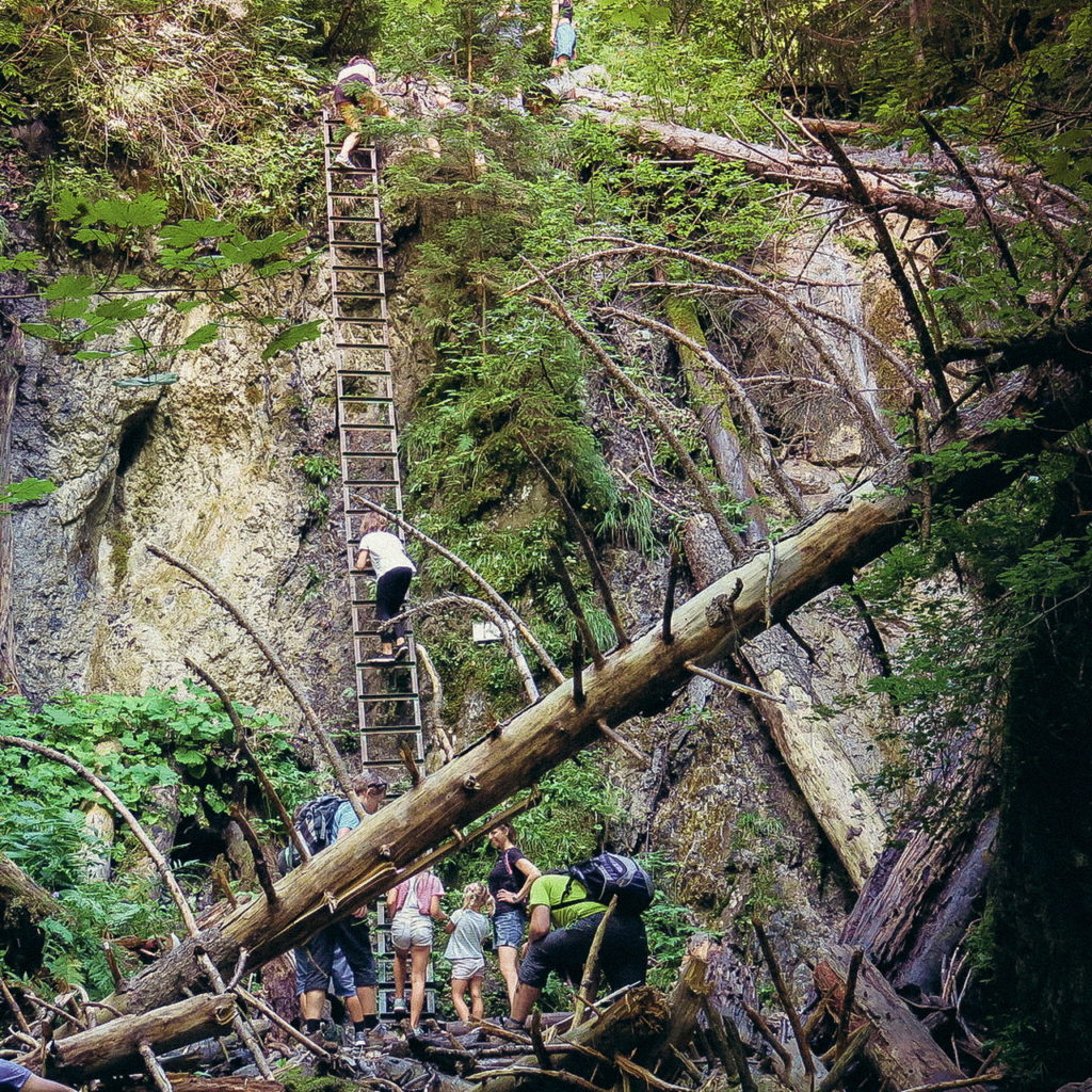 Itt hamarosan kettéágazik az út. A zöld a felfelé egyirányú, lépcsős, létrás szurdoktúra, míg a sárga a mindkét irányban járható, kicsit hosszabb kerülőút (létrák nélkül). Természetesen a zöldet válasszuk. A Sucha Bela-hoz hasonlóan a patak medrében haladunk felfelé, szikláról-farönkre lépkedve. Majd elérkezünk az első nagy vízeséshez, ami mellett két egymásba kapcsolt létra segítségével mászhatunk fel. A teljes akadálypálya körülbelül 1 óra alatt mászható meg.