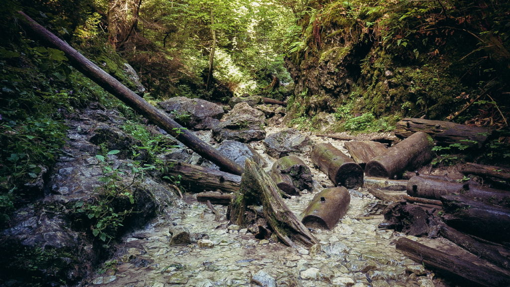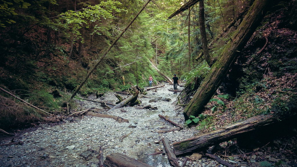 Az első szakaszon minimális emelkedés mellett a patak medrében haladunk. A kavicságyban néhol bokáig ér a víz, de akár vízálló bakancs nélkül is meg lehet úszni száraz lábbal, mert mindig van lépéstávon belül egy nagyobb kő, fatörzs vagy más hordalék, amiről tovább lehet ugrani. Felülről a fák árnyéka, alulról pedig hideg víz kellemesen természetes légkondit biztosít.