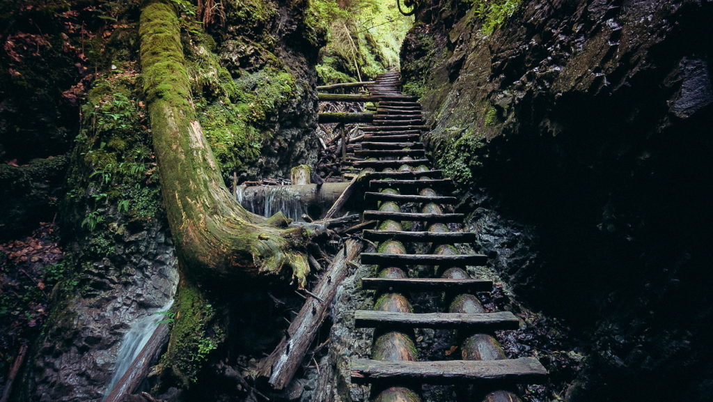 Talán az út negyedénél, harmadánál jön az első és talán legnagyobb létrarendszer egy kisebb vízeséssel felturbózva. Az első fémlétra kb. 45 fokban emelkedik, miközben a létrafokok is így állnak, azaz csak az élükre lehet lépni. A 45 fokos létrán haladni sokkal kellemetlenebb, mint az elsőre ijesztőbbnek tűnő függőlegesen, ami ezután következik. Ha a függőlegesen is túl vagyunk, jöhet pár fémtálca a vízesés felett. Ha valaki tériszonyos és ezen az első nagyobb akadályon túl van, akkor a többi már egyszerűbb lesz (visszafordulni amúgy sem lehet).