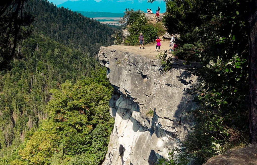 Itt a kölcsönzőnél térjünk le jobbra a sárga jelzésre és vegyünk felfelé az irány a fenyőfák közé. 15 perc enyhe emelkedőt követően egy tisztásra érünk, ahol lepusztult faházakat látunk, talán egy régi kemping maradványai. Itt két balrafordulással folyamatosan kövessük a sárga jelzést. Innét kb. 45 perc meredeken felfelé haladó menetelést követően elérjük a mai első állomást a Tamásfalvi-kilátó (Tomášovsky vyhlad) sátáni, 666 méter magas sziklateraszát. A 666 méter a tengerszint feletti magasságot jelöli, a Hernád körülbelül 160 méterrel alattunk hömpölyög a kanyonban. Elég pazar a kilátás, de azért ne nagyon feledkezzünk bele selfizgetés közben, mivel a sziklaperemet látványát szerencsére nem rontották el semmiféle korláttal, biztosítással.