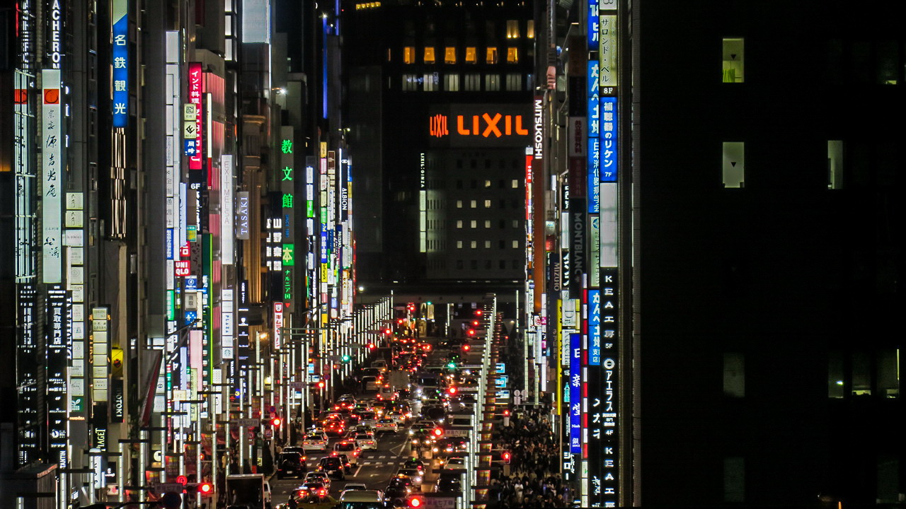 Mivel alig egy km-re volt a szállásunk Ginza főutcájától a Chuo Dori-tól, így adta magát, hogy érkezésünk estéjén ide sétáljunk be első benyomásokat gyűjteni Tokióról. A Chuo Dori Tokió Andrássy útja, legfényűzőbb bevásárló utcája, üzleti negyede, így itt leginkább a világmárkák szentélyei és a neon feliratok vakítják el a járókelőket. És persze itt vannak Japán legmagasabb négyzetméterárai is. Egy m2 földterület, telek 10 millió yen (25-30 millió Ft) feletti árakon forog.